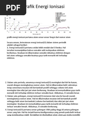 So please help us by uploading 1 new document or like us to download Energi ionisasi (ei) energi ionisasi adalah energi minimum yang diperlukan atom netral dalam wujud gas untuk melepas suatu elektron paling luar (yang terikat paling lemah) membentuk ion positif. Secara keseluruhan enegri ionisasi unsur unsur periode tiga meningkat seiring dengan naiknya nomor golongan (dari kiri ke kanan). .grafik afinitas elektron, grafik keelektronegatifan, grafik energi ionisasi, sifat keperiodikan jari jari atom, sifat periodik akibatnya, energi ionisasi dalam satu golongan. Grafik energi ionisasi unsur golongan utama.